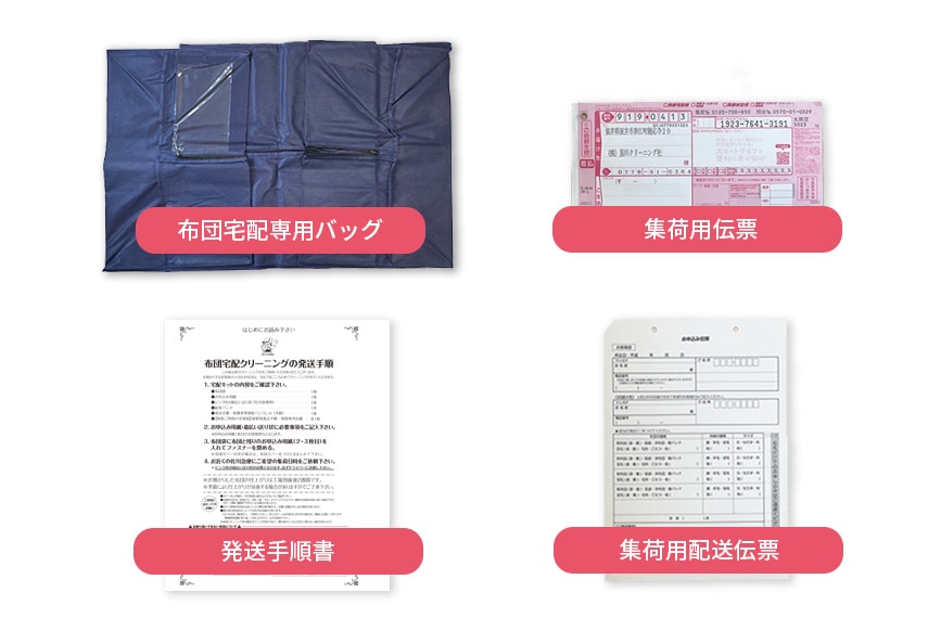 キットが届きましたら、中身をご確認ください。布団クリーニングの発送手順・着払い伝票・お申し込み伝票(4枚綴り)発送用集荷袋の4点が入っています。発送手順に従ってお申し込み伝票に必要事項を記入し布団をキットにいれてください。